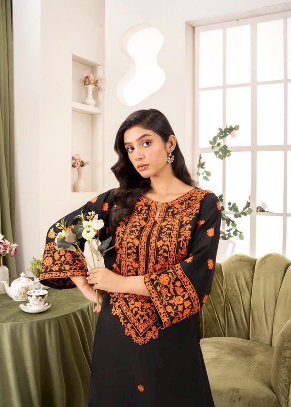 Introducing the sunny Grace– lifestyle collections Collection , an elegant ready-to-wear outfit designed for modern women who appreciate comfort with sophistication. This two-piece set is crafted from premium linen fabric, perfect for the winter season, offering both warmth and style. The classic black color with intricate embroidery adds a timeless charm, making it ideal for daily wear, office attire, and casual gatherings. The straight-cut kurta provides a graceful silhouette, while the flapper-style trouser adds a trendy touch to your overall look. This outfit combines style, comfort, and durability — making it an essential addition to your winter wardrobe.