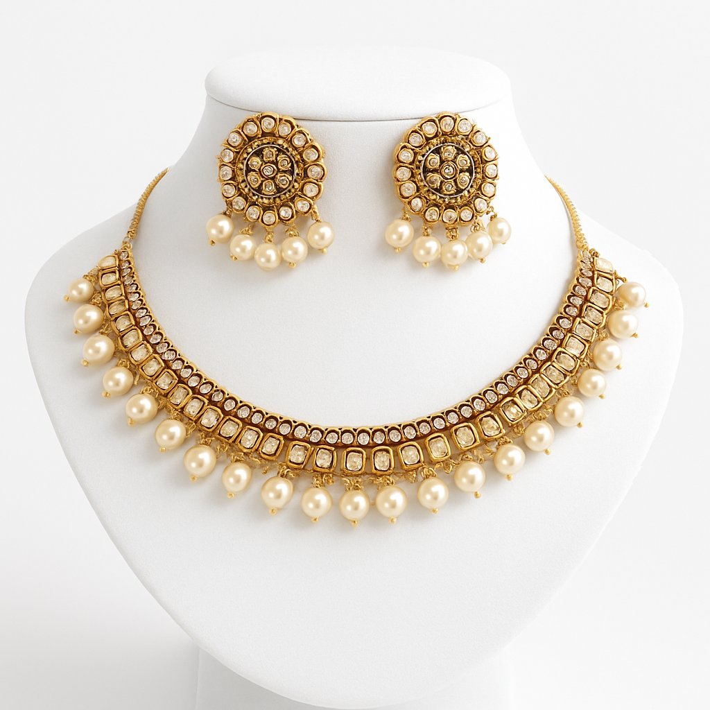 Elegant Gold Plated Kundan and Pearl Necklace Set with Matching Earrings - Traditional Bridal Jewelry