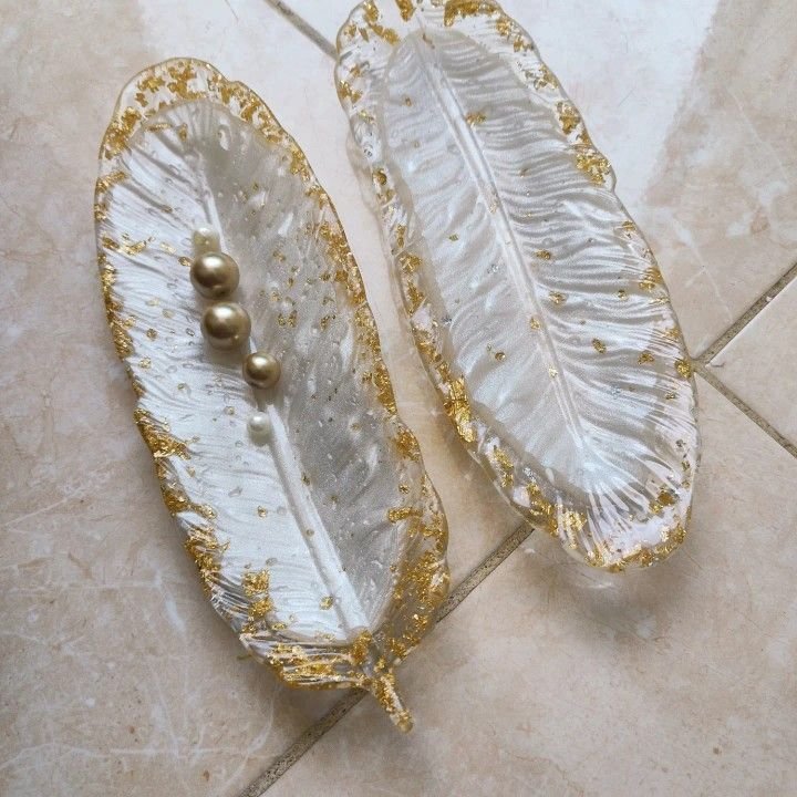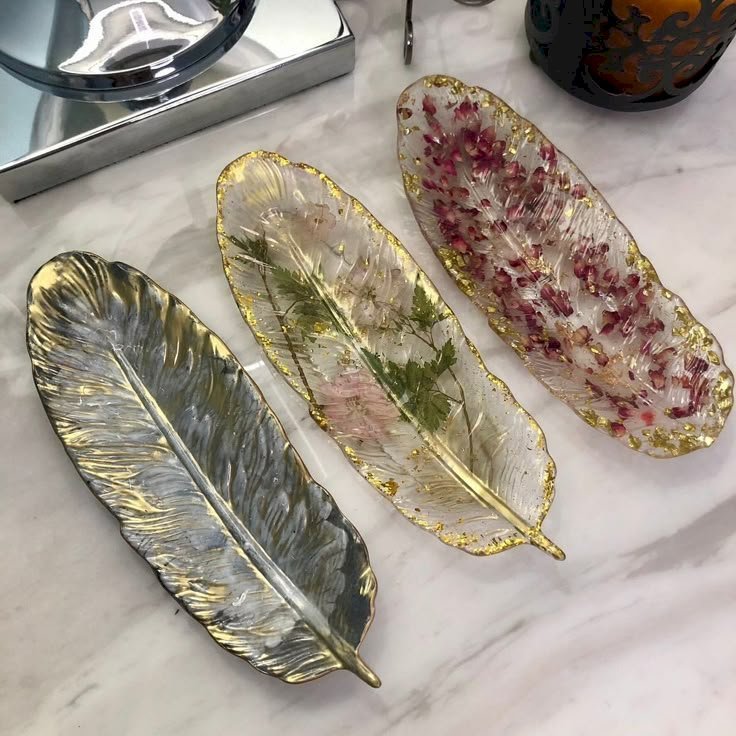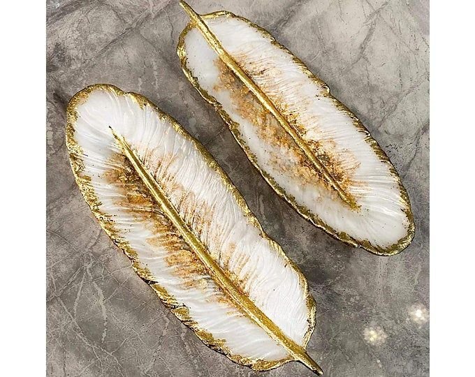These stunning pieces are meticulously crafted resin art, designed in the elegant shape of a feather. Perfect for adding a touch of luxury and bohemian chic to any space, they can serve as decorative trinket dishes, jewelry trays, or unique coasters.