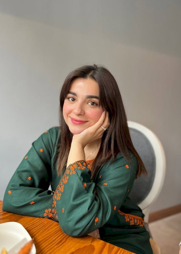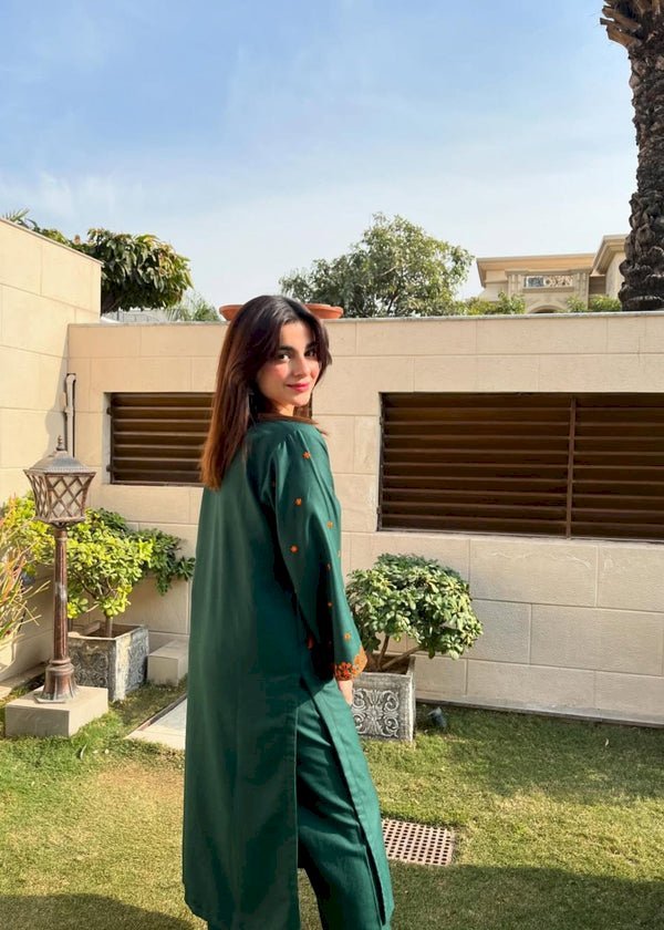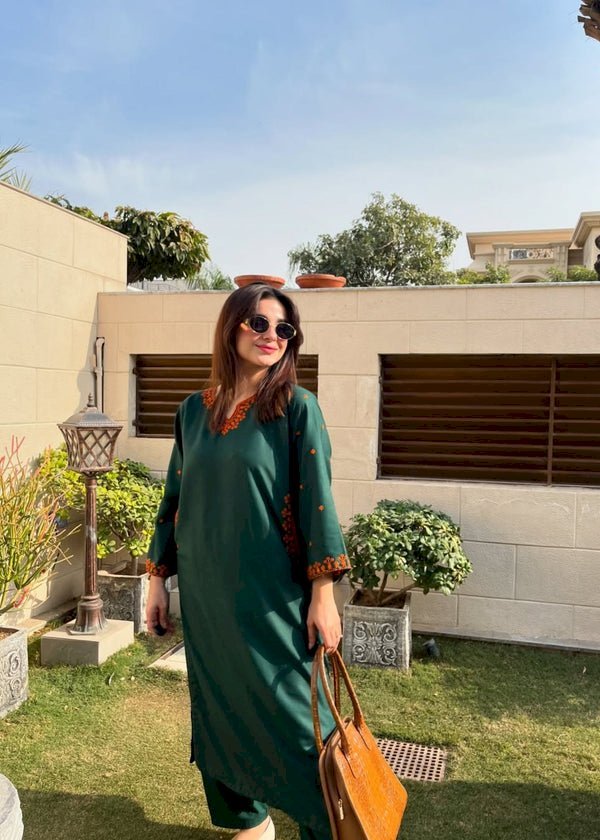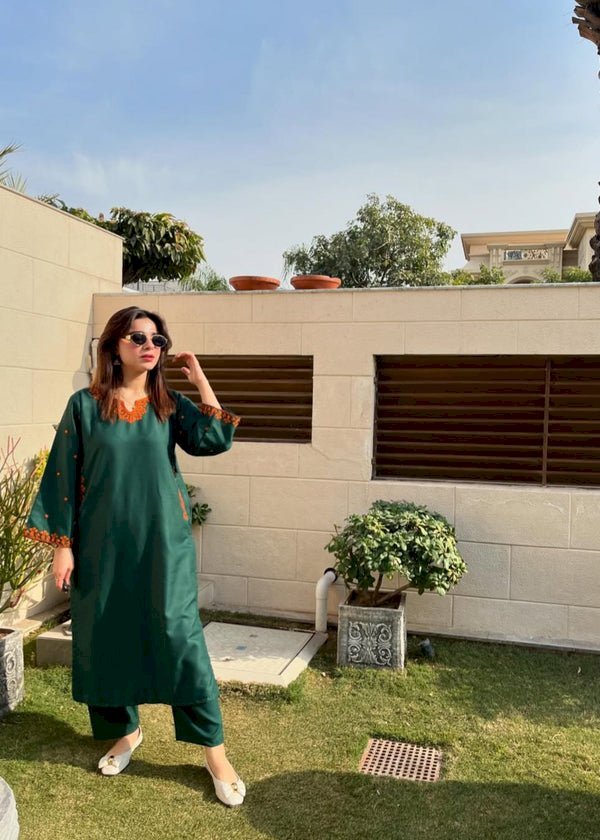 Experience timeless elegance with Golden Grace 2PCS – Stylish Collection. This bottle green linen outfit with golden embroidery offers a graceful and comfortable look. Perfect for summer wear, this stitched 2-piece set blends traditional charm with modern style — designed for confident, classy women.