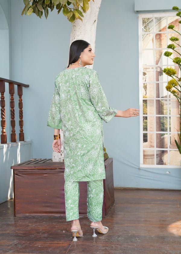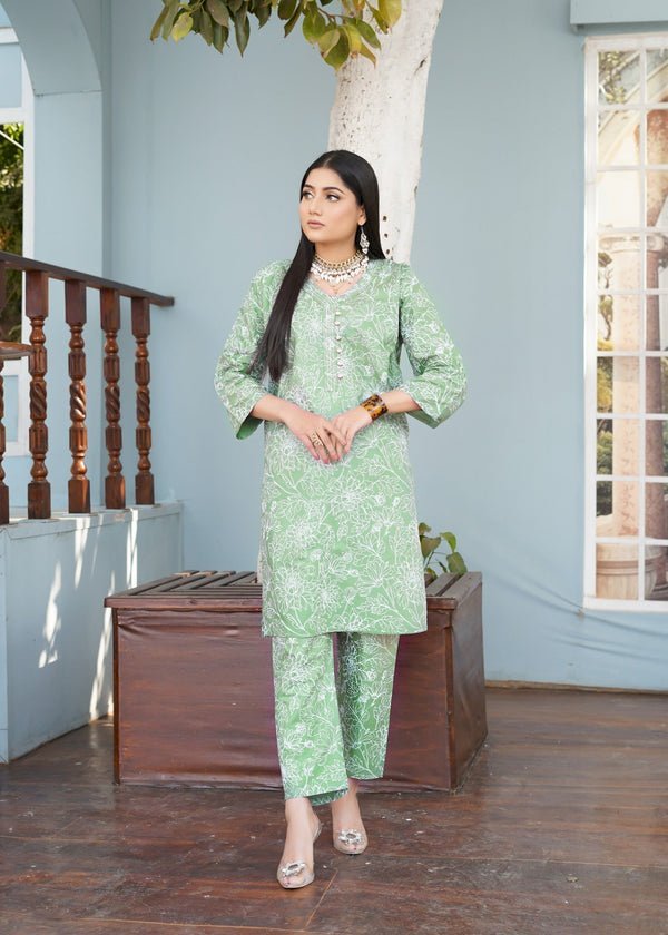 Elegant mint green 2-piece linen co-ord set for women, perfect for winter daily wear. Features screen printed V-neck shirt with straight trouser. Stylish & comfortable.