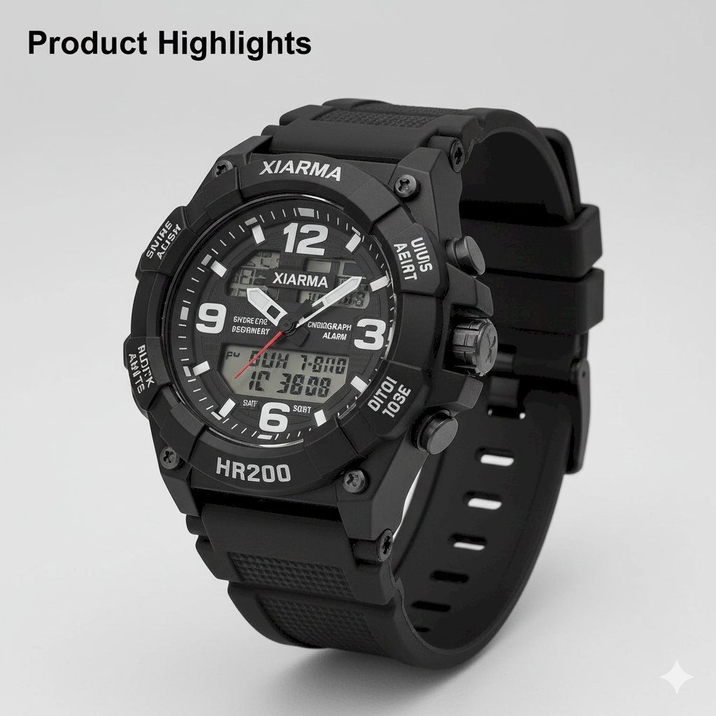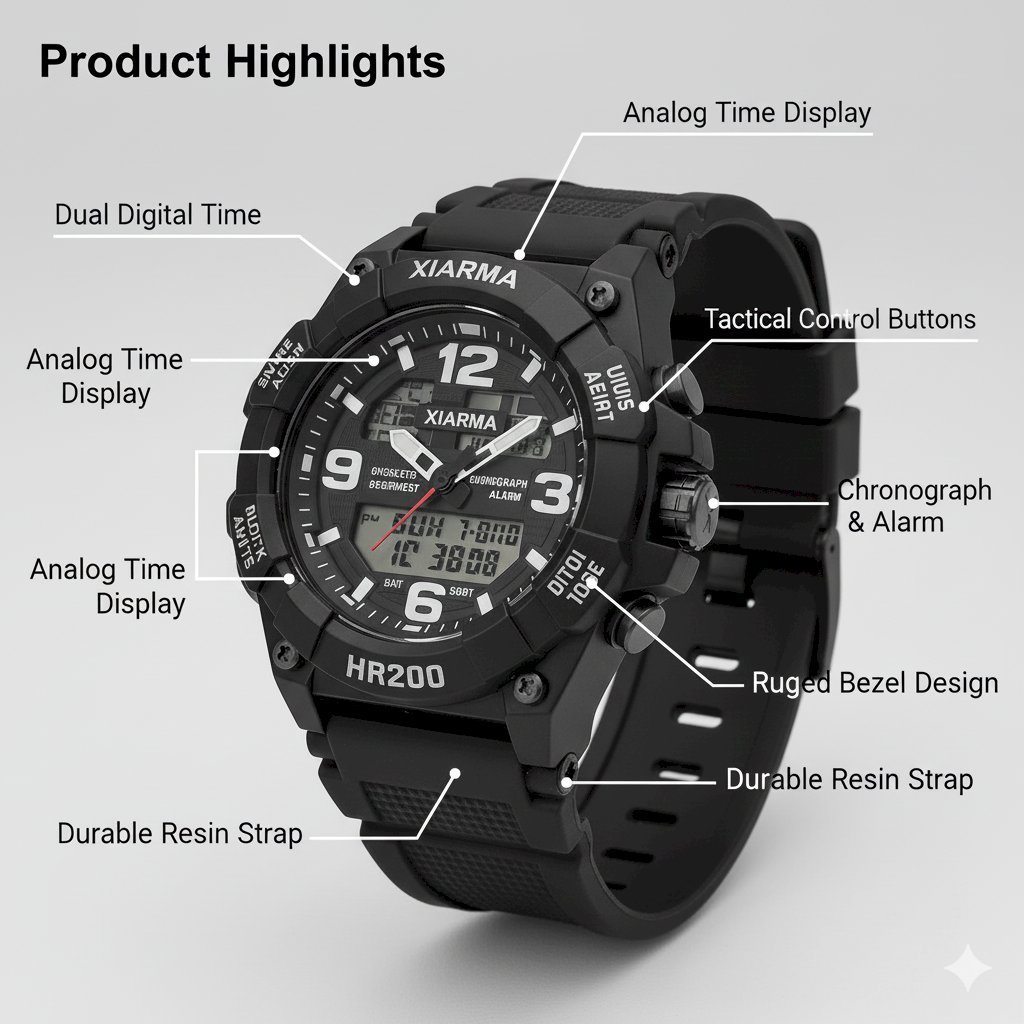 Crafted with a durable, shock-resistant casing and a comfortable, high-strength resin strap, the XIARMA HR9200 is ready for anything. Its striking black finish and bold, tactical design make a powerful statement on the wrist, perfect for outdoor enthusiasts, athletes, and those who demand reliability.